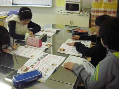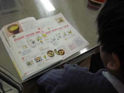 5年生の家庭科の授業の様子です。「ご飯とみそしる」の調理実習の事前学習に取り組んでいるところです。ご飯とみそしるの作り方を学んだ後に、グループ毎に計画表を作成しています。