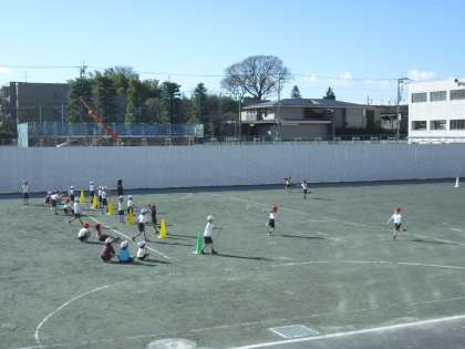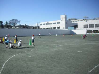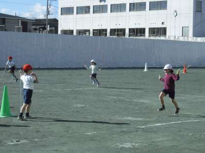 1年生の体育の授業の様子です。校庭で、短なわリレーを行っているところです。短なわ跳びをしながら走り、カラーコーンを折り返して、次の人にバトンタッチします。1年生もずいぶんと上手に短なわを扱うようになりました。