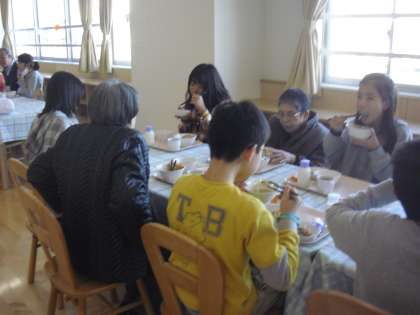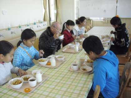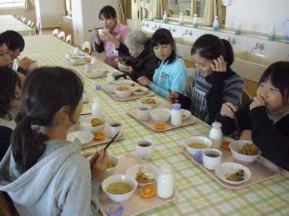 6年生のふれあい給食の様子です。芦花ホームの方々を多目的室にお迎えしての会食です。テーブルクロスが敷かれ、多目的室はランチルーム様式となりました。給食をいただきながらの楽しい会話に、和やかな時間が過ぎていきました。