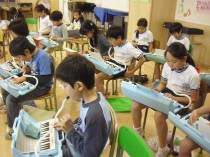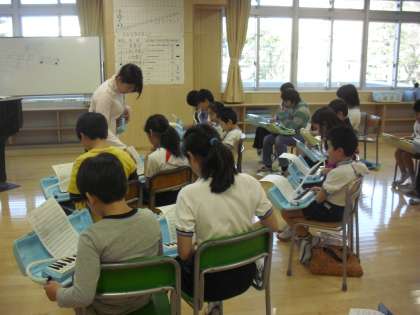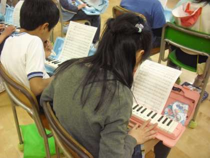 4年生の音楽の授業の様子です。けん鍵盤ハーモニカで「ソーラン節」の演奏の練習をしているところです。4年生にとっては、運動会で取り組んだ親しみのある曲です。音符を読みながら練習しています。