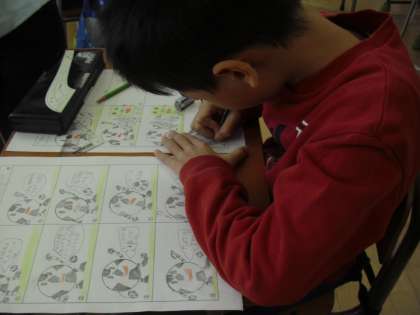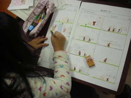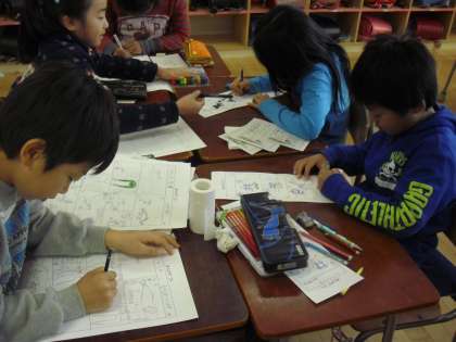 3年生の図画工作の授業の様子です。4コマまんがの制作に取り組んでいるところです。描いたり、ストーリーを考えたりするのが楽しくて、一人でいくつものまんがを描いている人がたくさんいました。