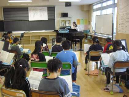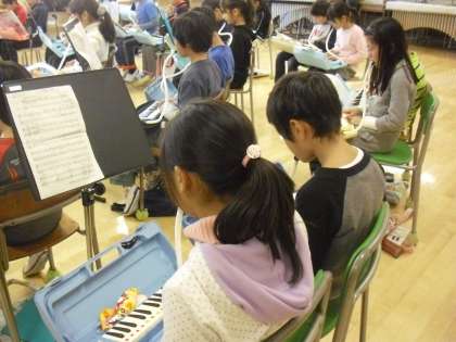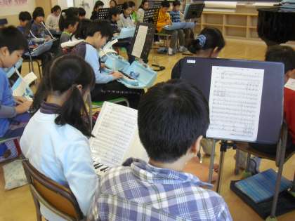 4年生の音楽の授業の様子です。鍵盤ハーモニカで「ソーラン節」の演奏に取り組んでいるところです。拍の長さを数えながら吹く部分があり、各自が楽譜をしっかり見ながら演奏しています。