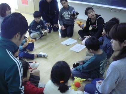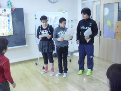 ひかり学級の授業の様子です。明日のお楽しみ会のリハーサルを行っているところです。司会の子どもたちがプログラムを進め、みんなでゲームの内容を練習したり、各自の役割を確認したりしました。