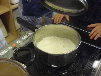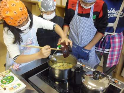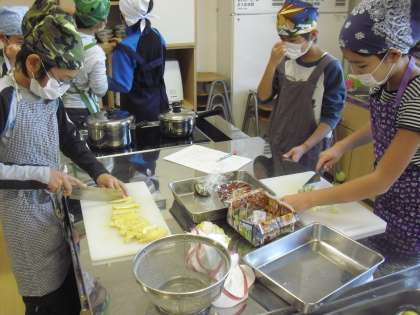 5年生の家庭科の授業の様子です。調理実習「ご飯とみそしる」に取り組んでいるところです。みそしるの具材を切り、鍋に入れ、味噌を加えます。ご飯もおいしく炊くことができました。手分けをして協力して作業を進めています。