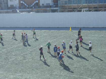 3年生の体育の授業の様子です。バスケットボール型ゲームに取り組んでいるところです。スリーコートを準備し、全6チームがゲームができるように工夫しています。ゲームを繰り返すことを通して、必要な技能を身に付けていきます。
