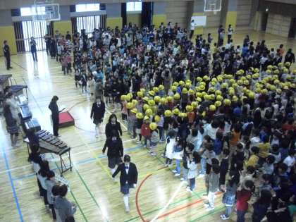 今朝の小中合同音楽朝会の様子です。小学校は全児童、中学校は中学3年生が参加しました。小学生全員で中学3年生を拍手で迎えます。中学3年生は、ひな壇に整列しました。