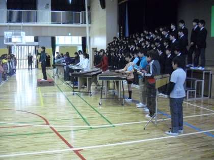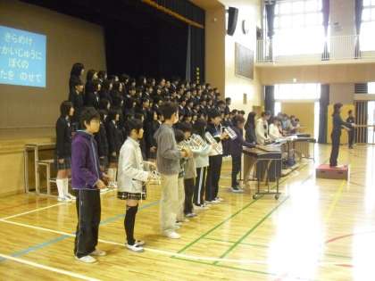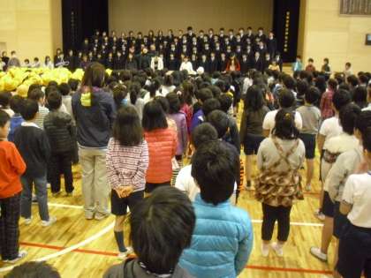 小学生、中学3年生がいっしょに「マイバラード」を歌いました。伴奏は小学校の器楽委員会です。小中学生の歌声が体育館に響きわたりました。