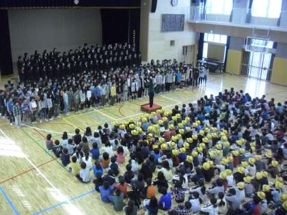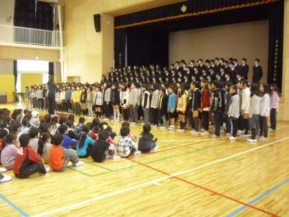 最後に、11月3日の新校舎落成・創立50周年記念式典で5・6年生と中学生が歌った「COSMOS」を歌いました。当日、式典に参加できなかった1年生から4年生に聴いてもらうためです。当日のように気持ちをこめて歌う5・6年生、そして小学生をしっかりと支えて歌う中学3年生が一体となった姿を、子どもたちは未来の自分と重ねていたかもしれません。