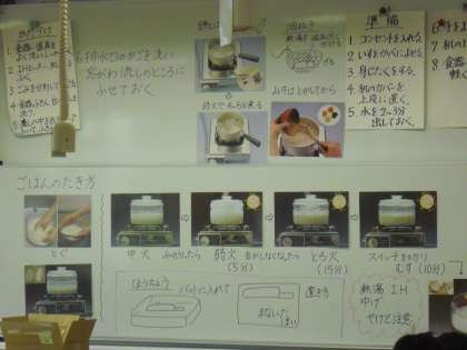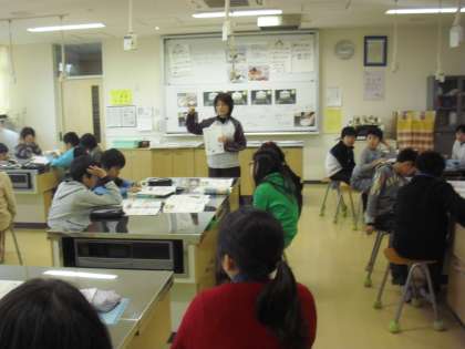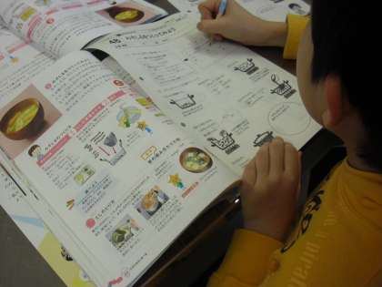 5年生の家庭科の授業の様子です。「ご飯とみそしる」の調理実習の計画を立てることが今日のねらいです。まず、ご飯の炊き方とみそしるの作り方を学習します。教科書に示されている手順をみんなで確認しているところです。