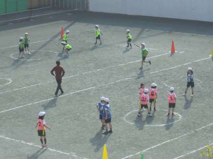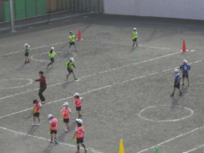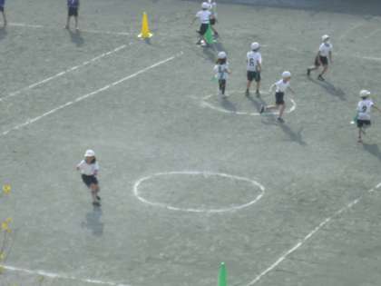2年生の体育の授業の様子です。鬼遊びをしているところです。コート内のサークルは安全地帯です。相手にタッチされないようにコートの端から端までを走りぬけると得点です。運動量のある鬼遊びです。
