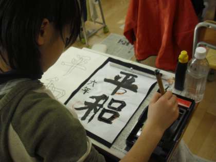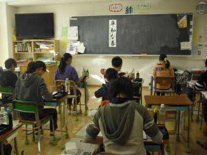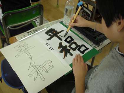 6年生の書写の授業の様子です。書き初めの課題「平和な春」の練習に取り組んでいるところです。お手本を見ながら、文字のつくりを確かめ、筆の運び方を繰り返し、何度も何度も練習しています。