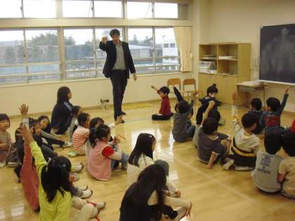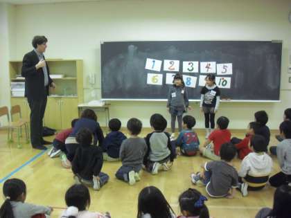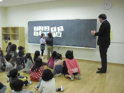 1年生の英語活動の授業の様子です。今日は「数字」をテーマに授業を進めています。ゲーム形式で、ALTの先生の発音した数字の絵カードを当てました。子どもたちにも分かりやすいルールで楽しく英語に親しむことができました。