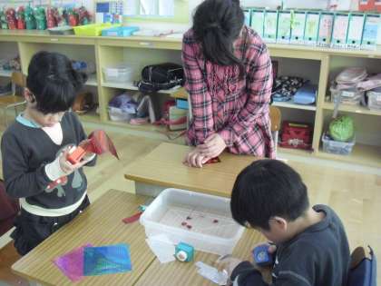 ひかり学級の授業の様子です。みんなで手分けをして、クリスマスツリーの装飾を作っているところです。いろ紙を形ぬきしたり、綿で雪を作ったり、リボンでツリーを飾ったり役割を分担して進めています。
