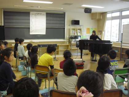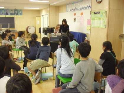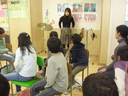 4年生の音楽の授業の様子です。「ソーラン節」の合奏に取り組むに当たり、使用する楽器の説明をしているところです。楽器の特長や使い方を理解してから、担当楽器を希望に基づいて話し合い等で決めていきます。