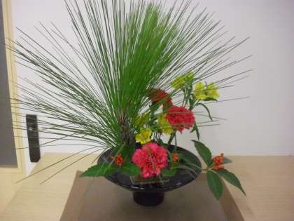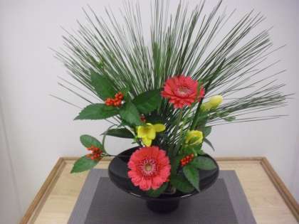 中学校生け花部の作品です。上の写真は、小学校保健室前の作品です。花材は、カーネーション、アリストロメリア、千両、大王松です。下の写真は、職員室前の作品です。花材は、大王松、千両、フリージア、ガーベラです。とても落ち着きのある作品です。