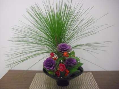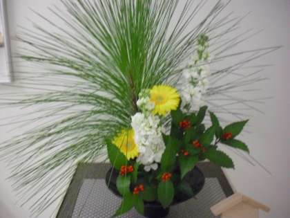 上の写真は、中学校東昇降口前の作品です。花材は、大王松、千両、ストック、ガーベラです。下の写真は、西昇降口前の作品です。花材は、大王松、千両、スプレーバラ、ハボタンです。いつも心を和ませてくれる生け花部の作品です。