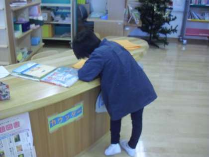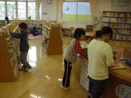 ひかり学級の図書の時間の様子です。読んでみたい本を選んで、思い思いの場所で読んでいます。借りたい本がある人は、自分でカードに本の題名を記入しています。図書室のいろいろなコーナーの本にふれました。