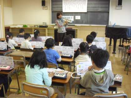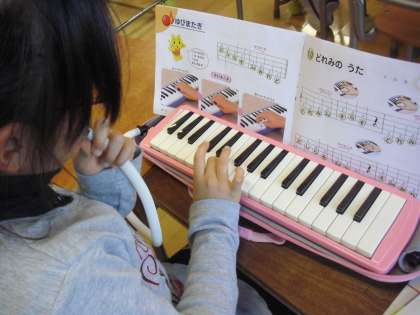 1年生の音楽の授業の様子です。鍵盤ハーモニカで指づかいの練習をしているところです。ドシラソファの次のミの音を指をまたぐようにして弾きます。何度も何度もくり返して練習しました。