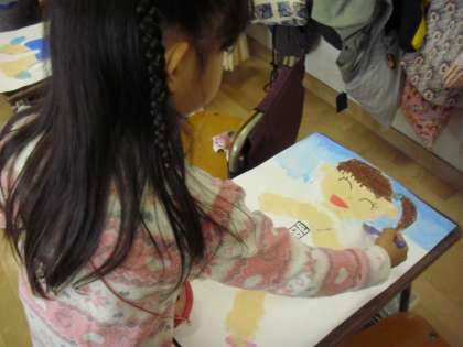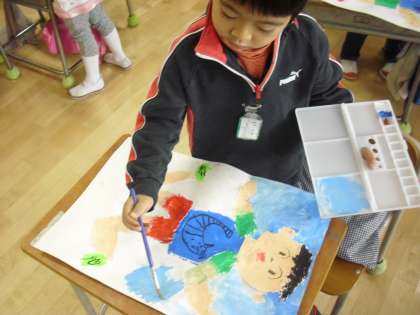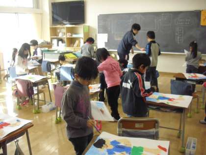 1年生の図画工作の授業の様子です。なわとびの絵の制作に取り組んでいるところです。絵の具を使って背景に色を付けています。パレットを持ちながら丁寧に絵筆を使って塗っています。