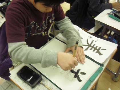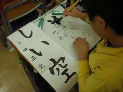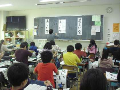4年生の書写の授業の様子です。書き初めの課題「美しい空」の練習に取り組んでいるところです。漢字の筆順、筆の入り方、とめ、はね、はらいを確認して文字を書いています。集中しているのでとても静かです。