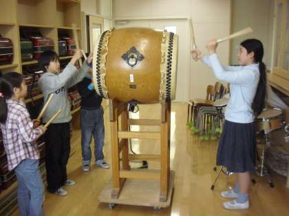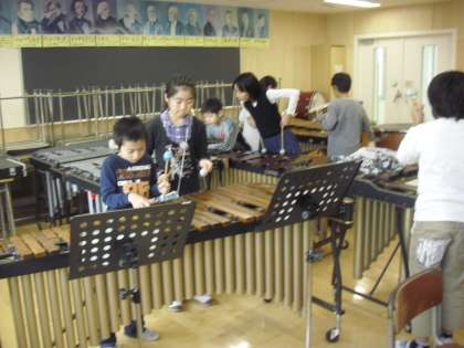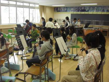 4年生の音楽の授業の様子です。「ソーラン節」の合奏の練習をしているところです。楽器毎のパートに分かれて練習しています。楽譜を見ながら、互いに教え合って進めています。
