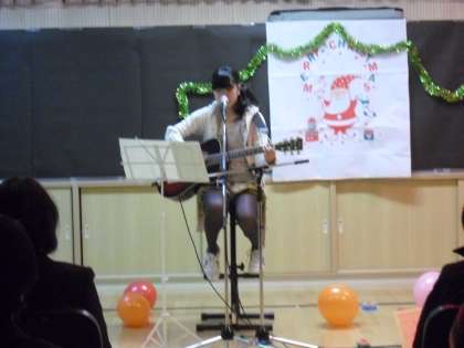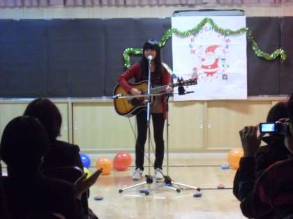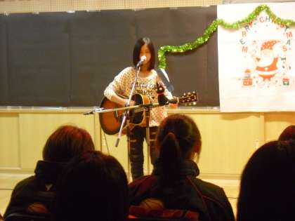 中学校のアコースティックギター部のクリスマスライヴの様子です。中学校の音楽室で行いました。会場には保護者や生徒がライブの応援に来ていました。テンポのよい曲には会場から手拍子が送られ、ライヴを盛り上げました。