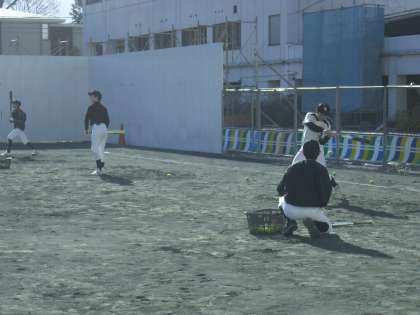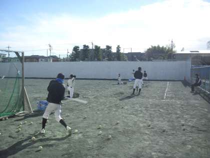 部活動の様子です。校庭で野球部が練習をしているところです。午後の練習はトスバッティングから始まりました。しっかりとしたスイングでボールの芯をとらえることができるようにテニスボールを使用するなど工夫しています。
