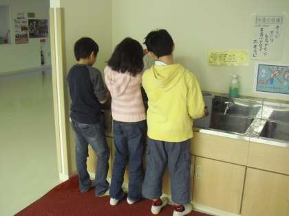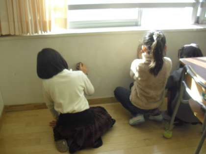 教室の壁の汚れを落としたり、流しを洗ったり、給食の配膳台をきれいにしたりとみんなで手分けをして、今年最後の掃除をしています。感謝の気持ちをこめて一生懸命に行っています。