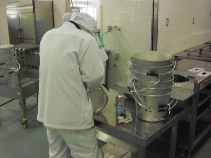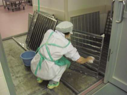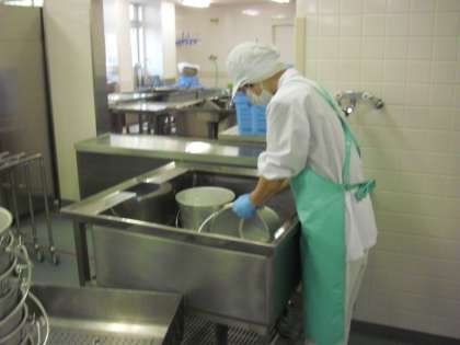 調理室の清掃の様子です。既に洗ってあった食管をもう一度調理員さんたちが手作業で丁寧に洗っているところです。3学期も子どもたちにおいしい給食を提供できるように準備をしています。