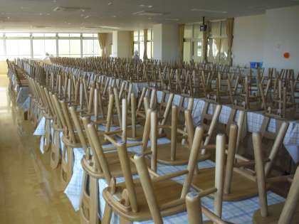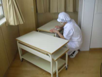 多目的室の清掃の様子です。12月からランチルーム機能を生かして活用を始めた多目的室。栄養士と調理員さんたちで今年最後の清掃をしています。
