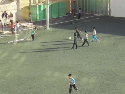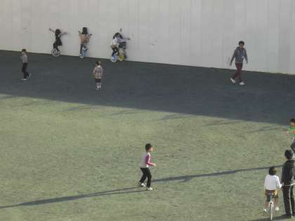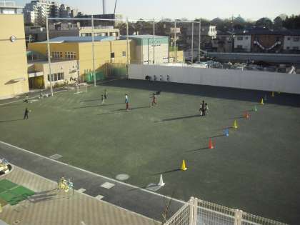 BOPの子どもたちが校庭で遊んでいます。サッカー、なわ跳び、一輪車など、思い思いの遊びで過ごしています。元気のよい声が校庭に響きわたります。