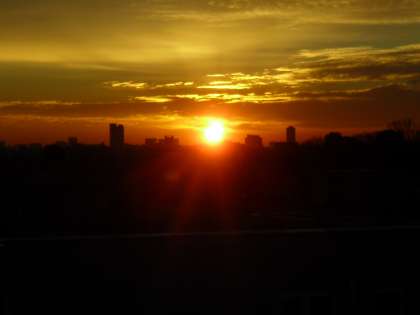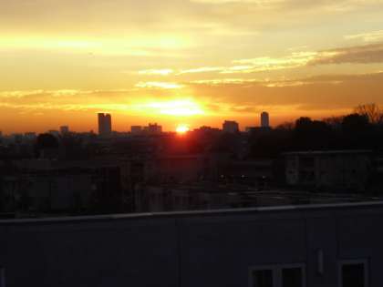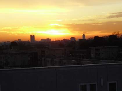 屋上から見た今朝の日の出の様子です。多少雲がかかっていますが、暁のきれいな朝日を見ることができました。空の様子は毎日違った光景を見せてくれます。