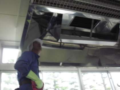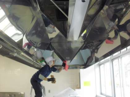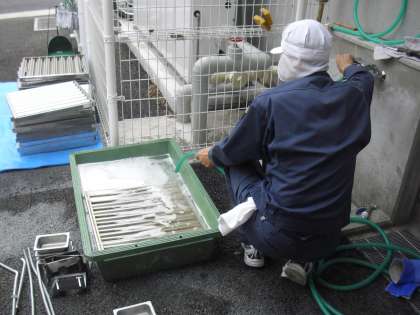 排気口を清掃している様子です。専用の洗浄液を使って、手作業で丁寧に拭き上げていきます。フィルターは、しばらく洗浄液に入れて汚れを浮かしてから、きれいに洗い流します。