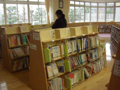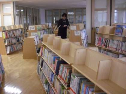 図書室の様子です。図書室担当職員が本が正しく本棚に入っているか、順番通りに並べてあるかを確認しているところです。3学期に気持ちよく図書室を使うことができるように整備をしています。