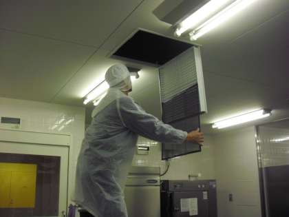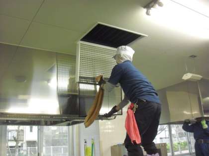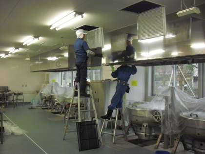 洗浄した換気口のフィルターを取り付けているところです。これで一日がかりの作業は終了です。業者の方々、ありがとうございました。