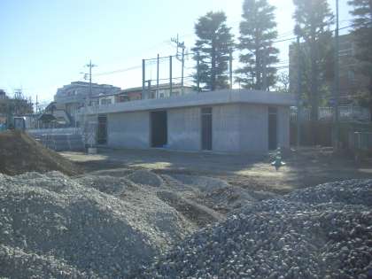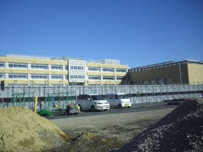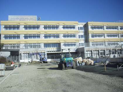 工事現場から見た校舎の様子です。校庭整備等の工事も今日から始まります。南門の前には体育倉庫を建設中です。安全に工事が進むことを願っています。