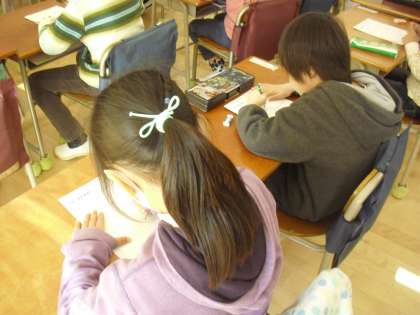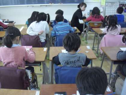 1年生の学級活動の授業の様子です。3学期のめあてを考えてカードに記入しているところです。1年間のまとめとなるようなめあてにしたいと思います。