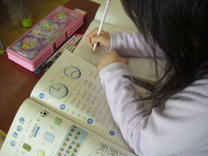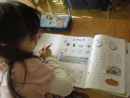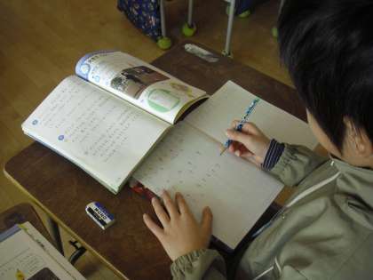 1年生の算数の授業の様子です。教科書の練習問題を各自が解いて、式や答えをノートに書き入れ、進めているところです。1・2学期で、自ら学習を進める力も身に付けてきました。