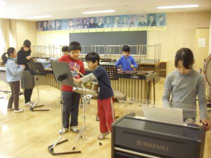 4年生の音楽の授業の様子です。「ソーラン節」の合奏に取り組んでいるところです。冬休みで間が空いたので、パートごとに教え合い、思い出しながら進めています。和太鼓の音が心地よく響いています。