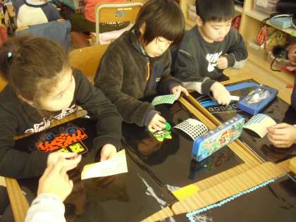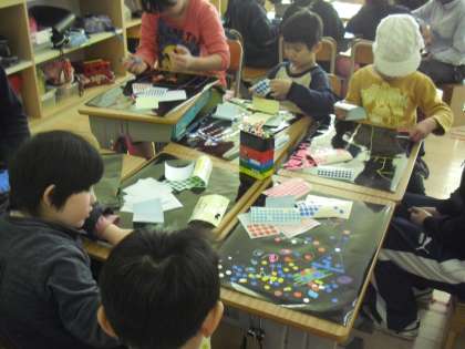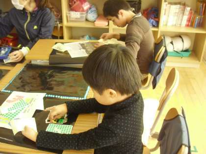 ひかり学級の図画工作の授業の様子です。冬の空をイメージした絵の制作に取り組んでいるところです。丸いシールの特徴を生かしながら描いています。色や大きさの違うシールを組み合わせて工夫しています。