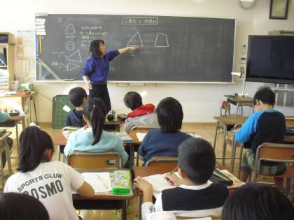 2年生の算数少人数指導の授業の様子です。三角形と四角形の学習に取り組んでいるところです。定規をつかって三角形や四角形を描いたり、辺や角など図形の構成について学習しています。