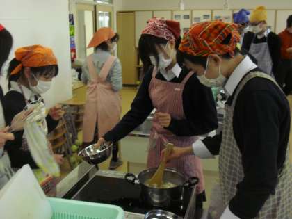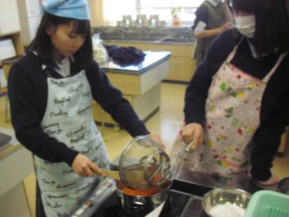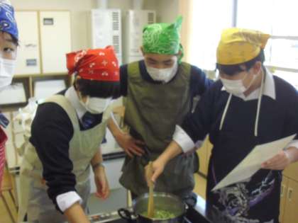 小学校の家庭科室で行った中学2年生のコンフィチュール作りの様子です。中学生がコンフィチュールの作り方を小学3年生に教えることを通して交流を深めます。レシピを読みながら自分たちで作業を進めています。