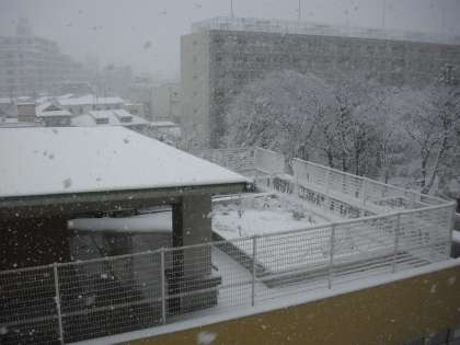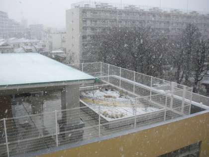 4階から見た3階の図工室テラスの様子です。テラスや準備室の屋根、木々や町並みも雪景色です。