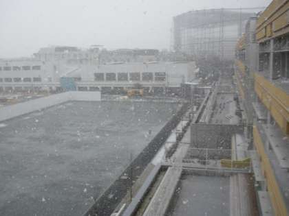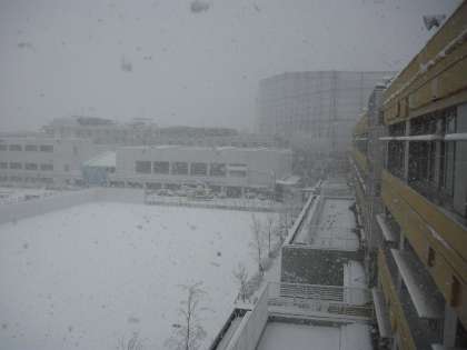 4階のプールから中学校体育館の方を見た様子です。1年生と6年生のテラスも雪が積もっています。校庭も一面雪です。中学校の体育館ではバスケットボール部が部活動を行っています。