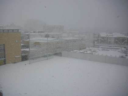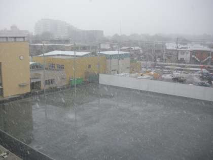 4階から見た校庭の様子です。BOPや八幡山保育園の屋根、防球ネットも白く見えます。工事現場にも雪が積もっています。