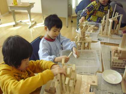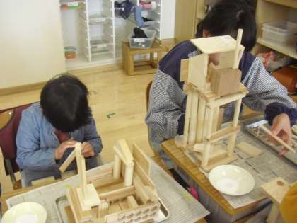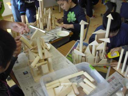 ひかり学級の図画工作の授業の様子です。お城の制作の続きに取り組んでいるところです。以前のお城と比べると、柱の数も多くなり、高く大きくなっていました。時間をかけて根気強く取り組んでいる成果です。