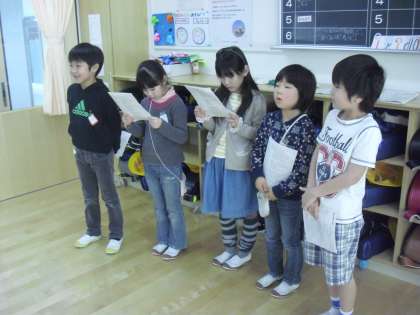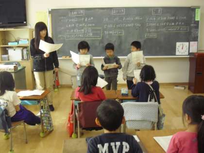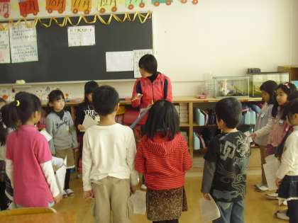 1年生の生活科の授業の様子です。来週予定している昔遊び大会の準備をしているところです。昔遊びの紹会や会の進行など、役割を分担して学年体制で練習しているところです。昔遊び毎に4つの教室に分かれて取り組みました。