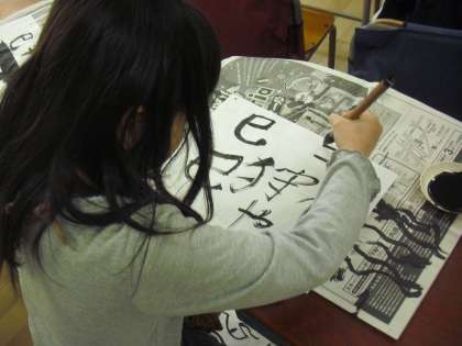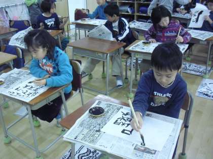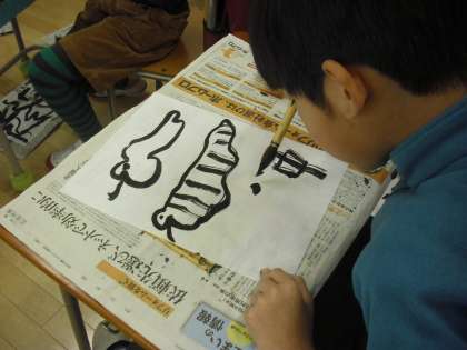 2年生の教科「日本語」の授業の様子です。筆の感触を味わっているところです。ゆっくりと筆を動かしながら、半紙に今年の干支の巳や好きな漢字を書いています。熱心に取り組む様子から興味・関心も高かったようです。