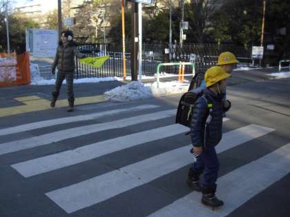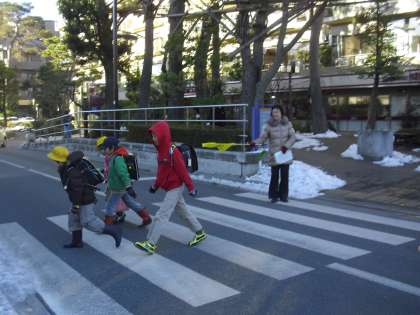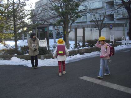 今朝のあいさつキャンペーンの様子です。キャンペーン最終日を迎えました。郵政公社前には、今朝も地域サポーターの方が子どもたちとあいさつを交わしています。千歳通りの横断歩道では、PTAの当番の方々が子どもたちの登校を見守ってくれています。