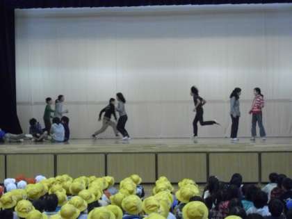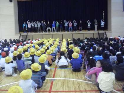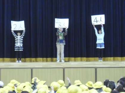 今朝の児童集会の様子です。今回は、集会委員会による「よ〜く見てね集会」です。集会委員会の演じる劇のなかに、三択クイズの答えがかくれています。